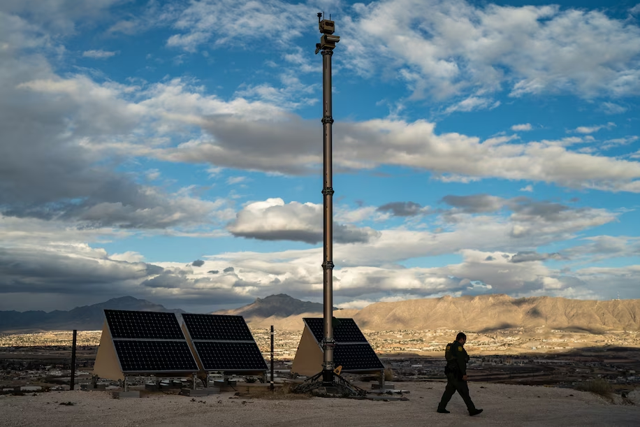 국경 순찰대 요원이 뉴멕시코 주 선랜드 파크 인근 국경 장벽 옆에 있는 안두릴이 만든 새로운 CBP 카메라 타워인 자율 감시 타워를 지나가고 있습니다(살완 조지스/워싱턴 포스트).