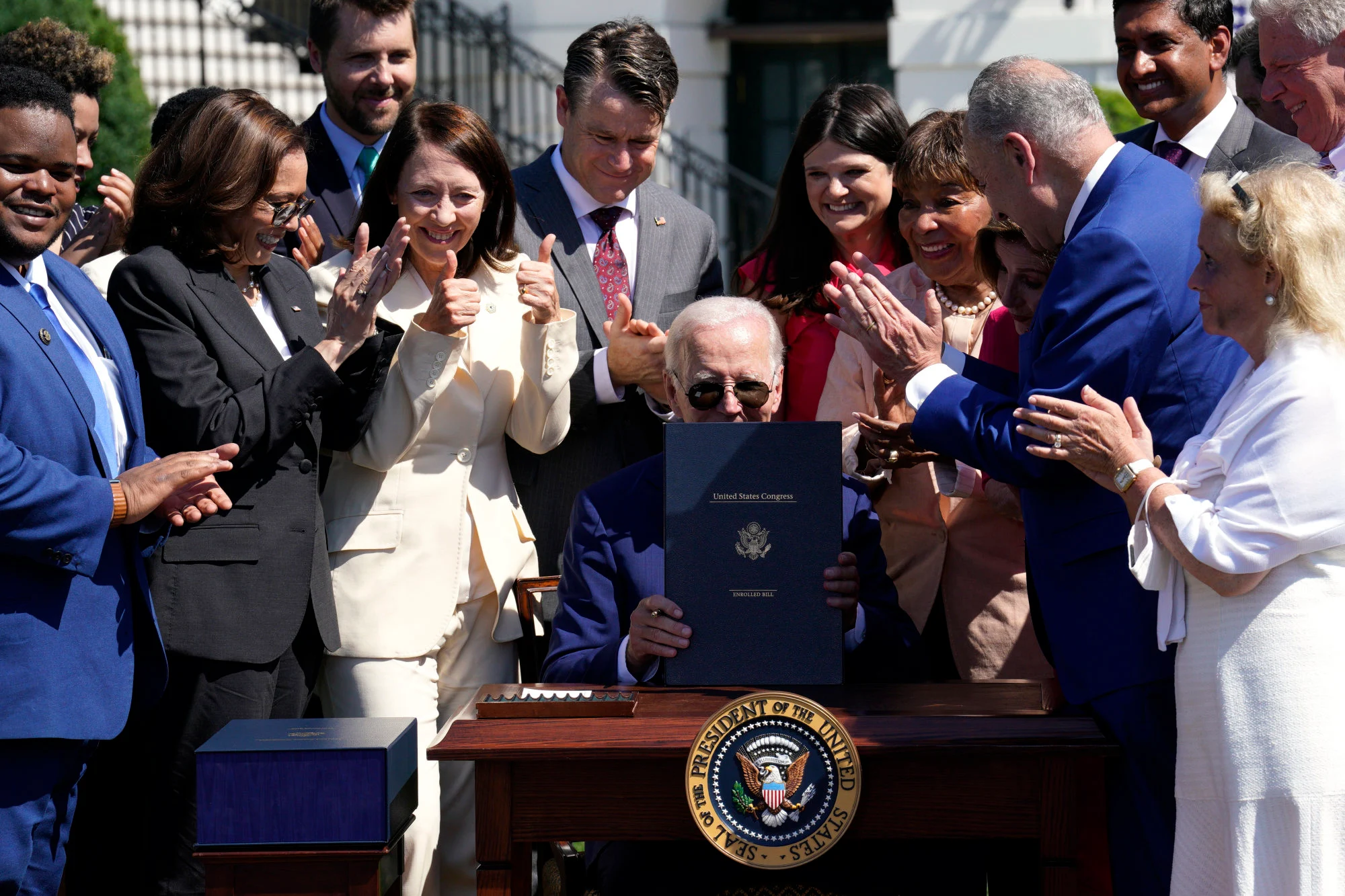 조 바이든 미국 대통령이 2022년 8월 9일 워싱턴 백악관 남쪽 잔디밭에서 칩 및 과학 법안에 서명하고 있습니다. 사진: 아바카 프레스/TNS