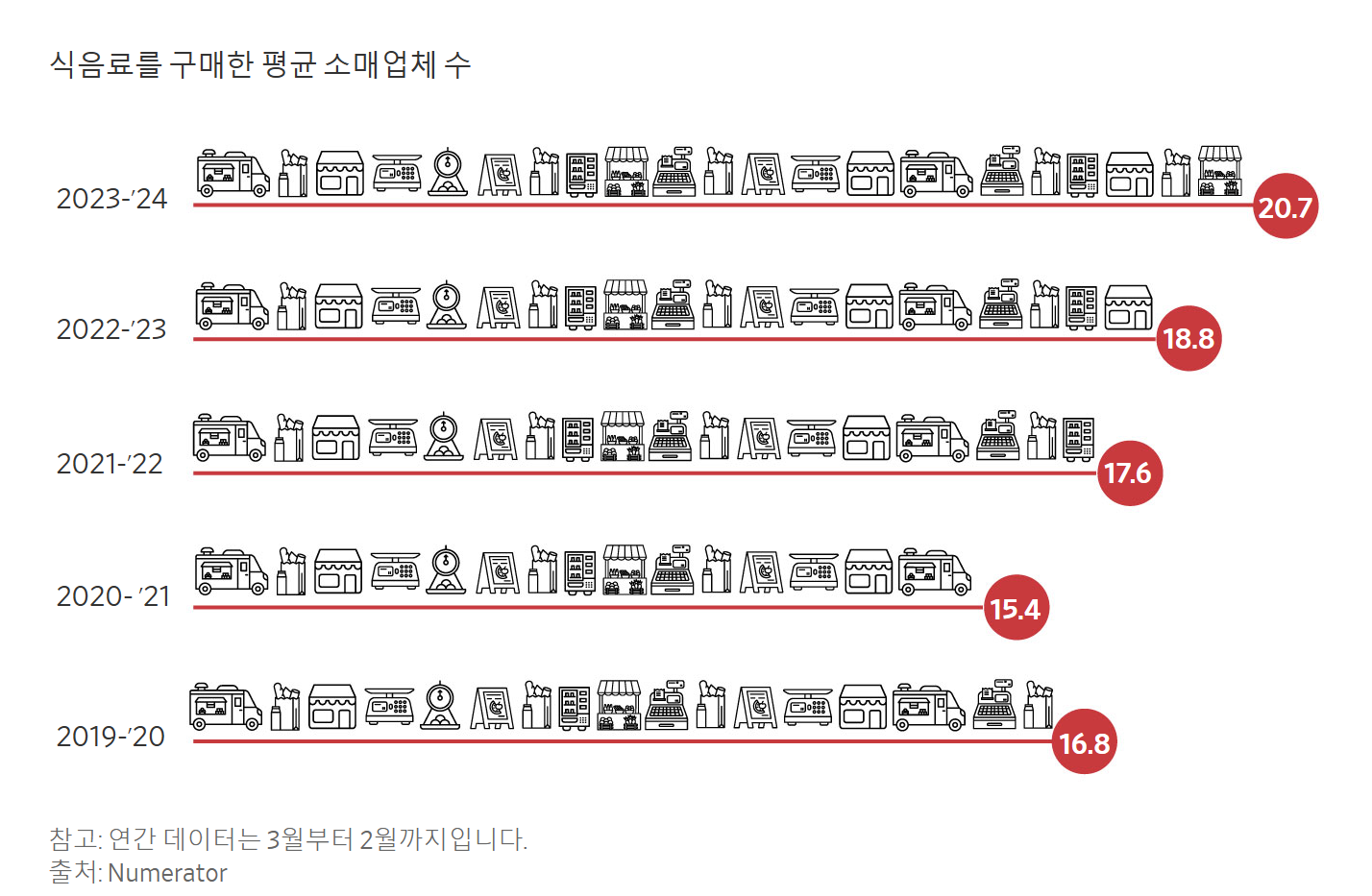 - 가격 상승 대응: 식료품 가격이 3년 동안 21% 상승하였고, 이에 따라 소비자들은 할인 행사를 찾아 여러 매장을 방문하고 있습니다.