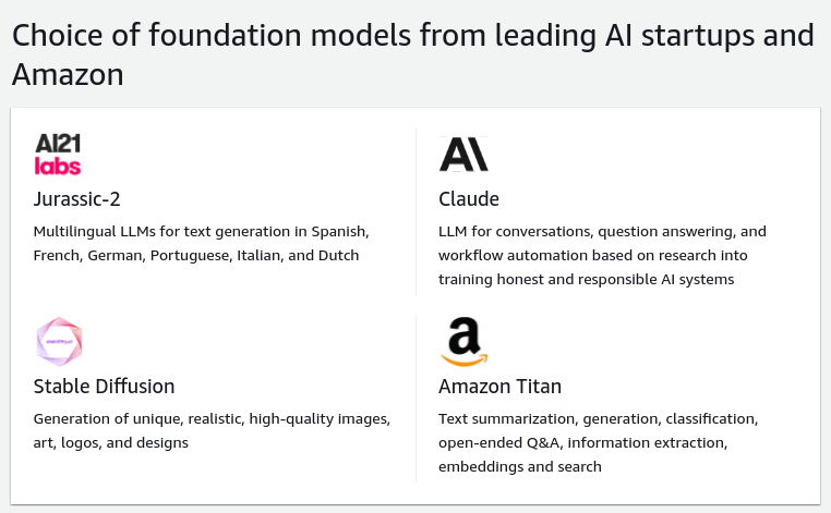AWS Bedrock는 다양한 산업과 창의적 분야에 걸쳐 생성 AI의 잠재력을 활용할 수 있는 포괄적인 플랫폼을 제공합니다.