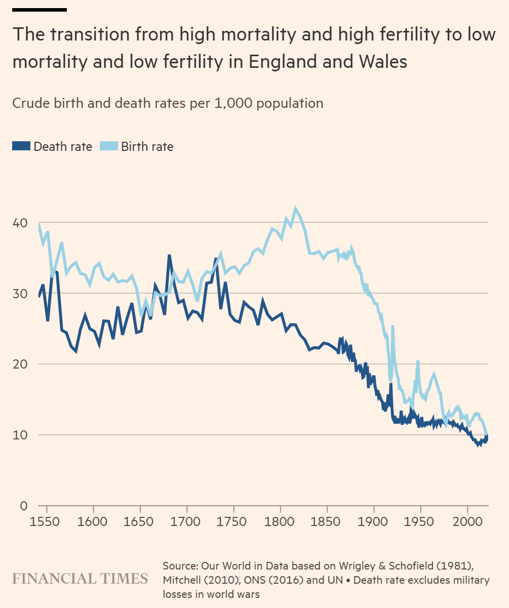 | Copilot 차트 설명 이 차트는 "영국과 웨일즈에서 높은 사망률과 높은 출산율에서 낮은 사망률과 낮은 출산율로의 전환"을 나타내며, 1500년부터 2000년까지의 인구 천 명당 출생률과 사망률을 보여줍니다. 두 개의 선이 그려져 있는데, 하나는 사망률을 나타내고 다른 하나는 출생률을 나타냅니다. 두 선 모두 시간이 지남에 따라 일반적으로 감소하는 추세를 보이며, 특정 시점에서 사망률이 급증하는 것을 볼 수 있습니다. 이는 전쟁이나 전염병과 같은 사건으로 인한 높은 사망률을 나타낼 수 있습니다. 데이터 출처는 "Our World in Data based on Wrigley & Schofield (1981), Mitchell (2010), ONS (2016) and UN - Death rate excludes military losses in world wars"로, Financial Times에 의해 인용되었습니다.