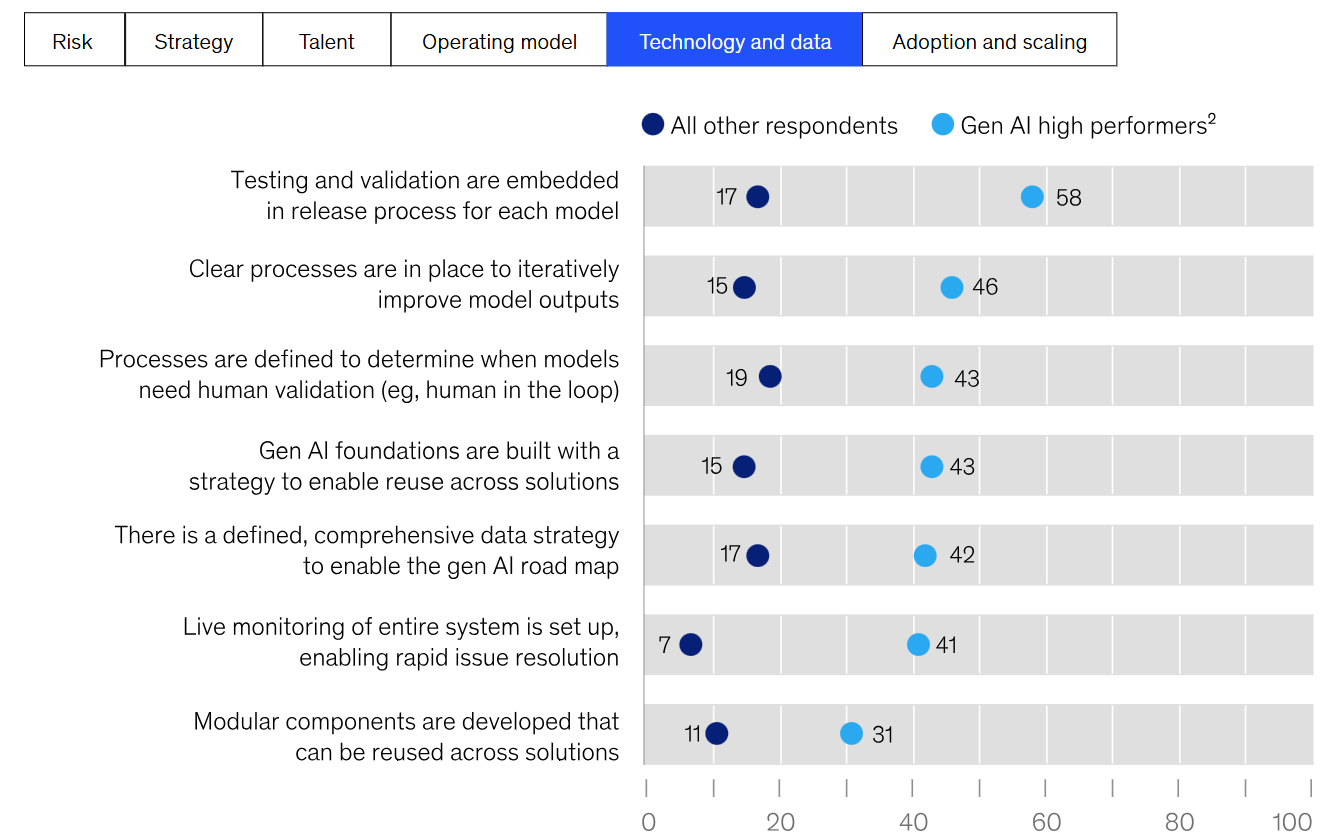 우선, 성과가 높은 조직은 평균 3개 부서에서, 그렇지 않은 조직은 평균 2개 부서에서 더 많은 비즈니스 기능에 세대 AI를 사용하고 있습니다. 이들은 다른 조직과 마찬가지로 마케팅 및 영업, 제품 또는 서비스 개발 부문에 가장 많이 사용하고 있지만, 리스크, 법률 및 규정 준수, 전략 및 기업 재무, 공급망 및 재고 관리 부문에서도 다른 조직보다 훨씬 더 높은 비율로 gen AI 솔루션을 사용하고 있습니다. 이들은 회계 문서 처리와 위험 평가부터 R&D 테스트, 가격 책정 및 프로모션에 이르기까지 다양한 활동에서 세대별 AI를 사용할 가능성이 다른 응답자들에 비해 3배 이상 높았습니다. 전반적으로 비즈니스 기능 내에서 보고된 젠 AI 애플리케이션의 약 절반이 공개적으로 사용 가능한 모델이나 도구를 활용하고 있지만, 젠 AI 고성과자들은 이러한 기성 옵션을 사용하는 것보다 상당히 맞춤화된 버전의 도구를 구현하거나 자체적인 기반 모델을 개발할 가능성이 더 높습니다.