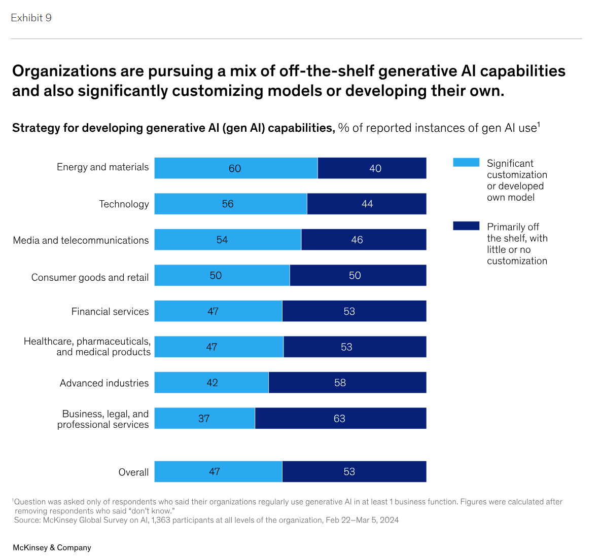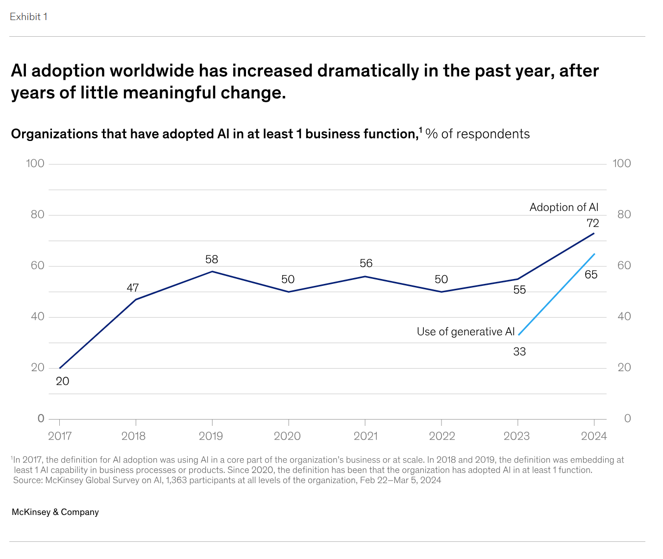 차트의 출처는 2024년 2월 22일부터 3월 5일까지 조직의 모든 수준에서 1,363명의 참가자를 대상으로 한 McKinsey Global Survey on AI입니다.
