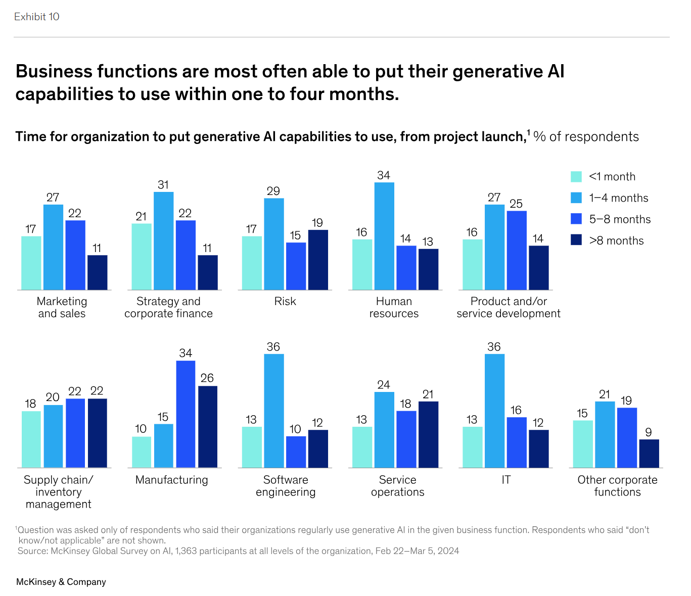 이 차트는 McKinsey & Company에서 제작한 것으로, "Businesses use within one to four months their generative AI capabilities to function most often able to put"라는 제목이 붙어 있습니다.