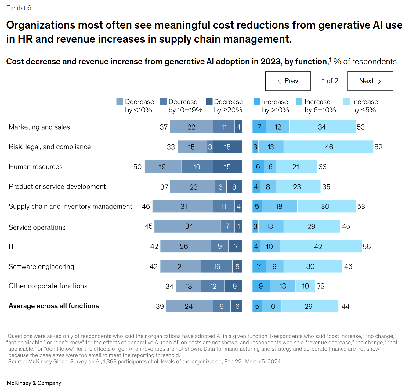 조직은 인사 분야에서 제너레이티브 AI를 사용하여 의미 있는 비용 절감을, 공급망 관리 분야에서 매출 증가를 가장 많이 경험했습니다.