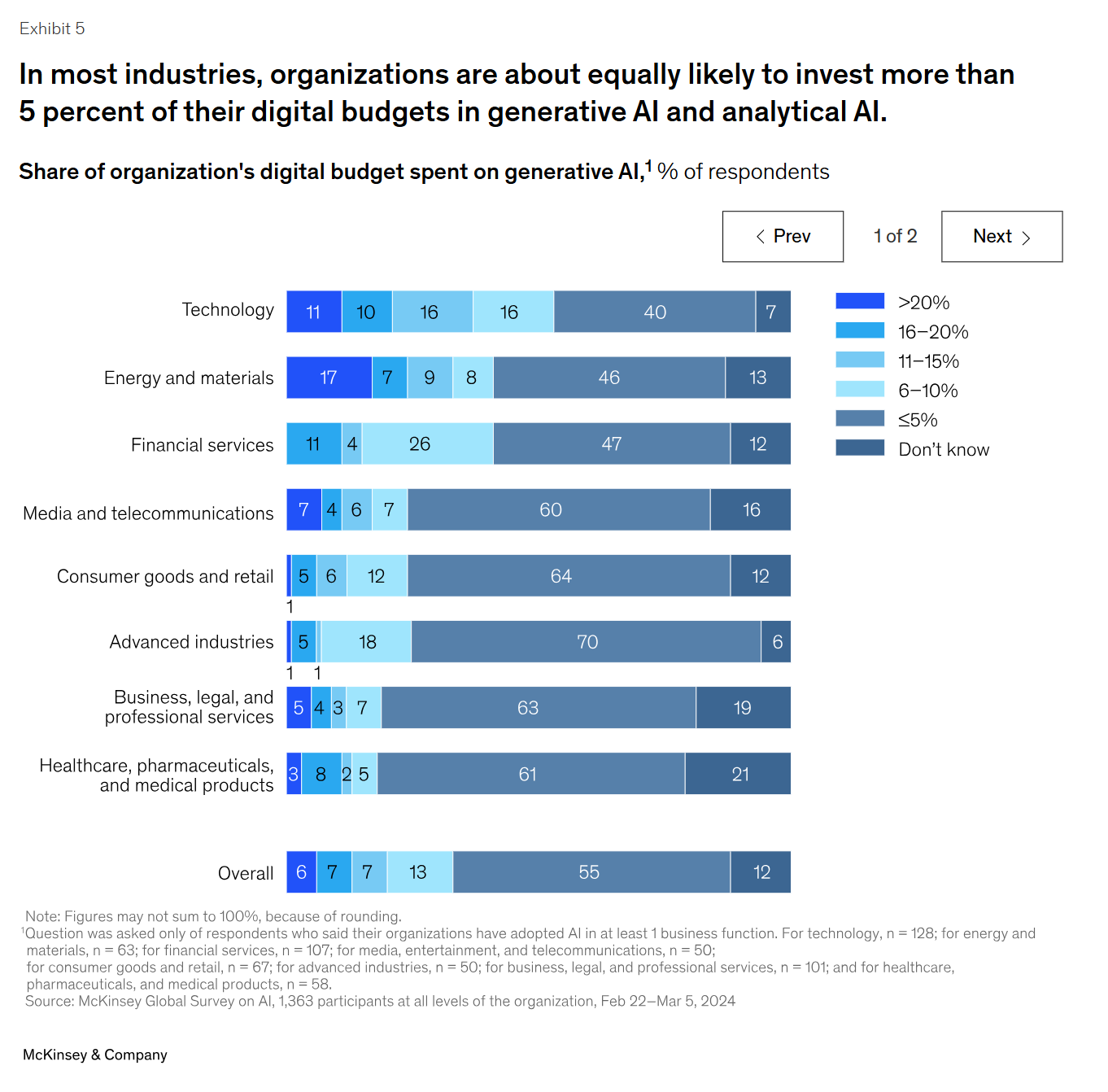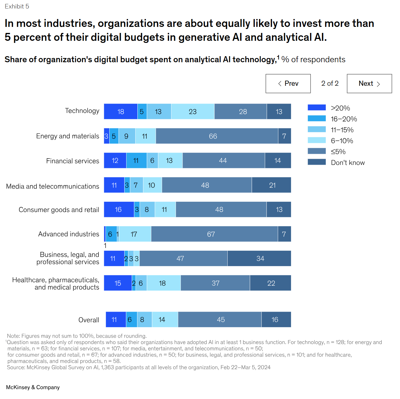 대부분의 산업에서 조직은 디지털 예산의 5% 이상을 제너레이티브 AI와 분석 AI에 투자할 가능성이 거의 비슷합니다.