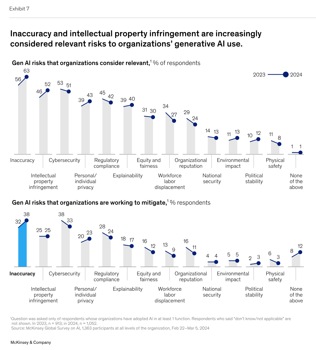 최근 설문조사 응답자들은 작년보다 더 많은 응답자가 자신의 조직에서 부정확성과 IP 침해가 세대 AI 사용과 관련이 있다고 생각한다고 답했으며, 약 절반은 계속해서 사이버 보안을 위험으로 간주하고 있습니다(예시 7).