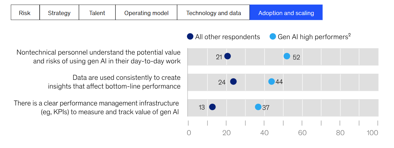 제너레이티브 AI 도입이 가속화됨에 따라 설문조사 응답자들은 측정 가능한 이점과 부정확성 위험의 완화를 보고했습니다. 소수의 고성과자 그룹이 이러한 변화를 주도하고 있습니다.