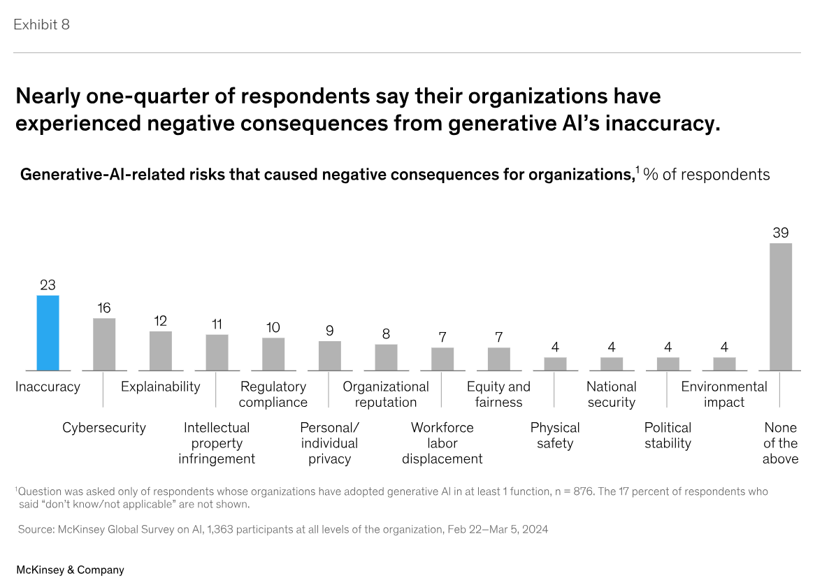 실제로 고객 여정 및 요약에서 코딩 및 크리에이티브 콘텐츠에 이르기까지 차세대 AI 가치 사슬 전반의 사용 사례에 영향을 미칠 수 있는 부정확성은 작년보다 응답자들이 조직이 이를 완화하기 위해 적극적으로 노력하고 있다고 답한 유일한 리스크입니다.