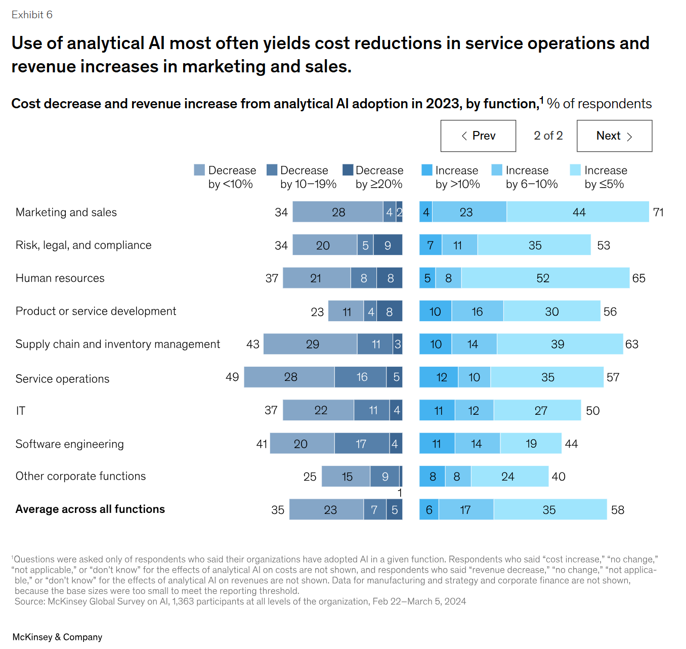 이러한 투자는 어디에서 성과를 거두고 있을까요? 최근의 설문조사에서는 처음으로 비즈니스 기능별로 인공지능 세대의 활용이 창출하는 가치를 조사했습니다. 응답자 중 가장 많은 비율의 응답자가 비용 절감을 경험했다고 답한 부서는 인적 자원 분야였습니다. 응답자들은 공급망 및 재고 관리에서 의미 있는 매출 증가(5% 이상)를 경험했다고 가장 많이 보고했습니다(표 6). 분석 AI의 경우, 응답자들은 작년에 조사한 결과와 마찬가지로 서비스 운영에서 비용 절감 효과를 보았다고 가장 많이 응답했으며, 마케팅 및 영업에서 AI를 사용하여 의미 있는 매출 증가를 경험했다고 답했습니다.