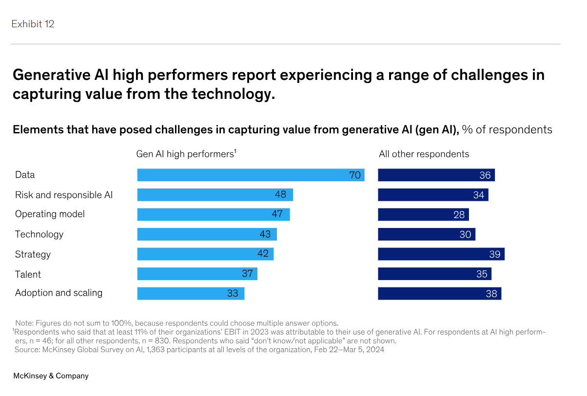 성과가 높은 기업들은 AI 세대 도입의 위험성을 경험한 것 외에도 다른 기업들에게 경고가 될 수 있는 다른 문제들을 겪었습니다(표 12). 70%가 데이터 거버넌스를 위한 프로세스 정의, 데이터를 AI 모델에 신속하게 통합하는 능력 개발, 부족한 학습 데이터 등 데이터와 관련된 어려움을 경험했다고 답해 데이터의 가치 창출에 있어 데이터가 얼마나 중요한 역할을 하는지를 강조했습니다. 또한 고성과자는 애자일 업무 방식 구현과 효과적인 스프린트 성과 관리와 같은 운영 모델에 어려움을 겪고 있다고 응답할 가능성이 다른 사람보다 높았습니다.
