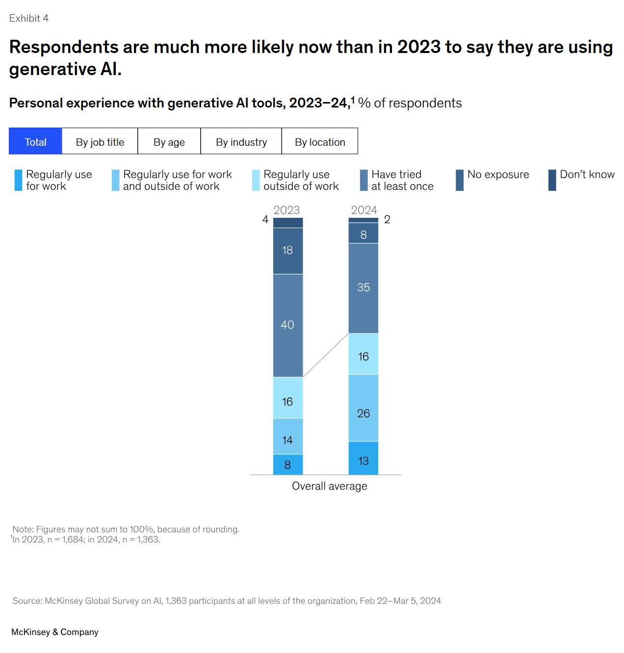 2. 정기적인 업무 사용: 업무에 정기적으로 제너레이티브 AI를 사용하는 응답자의 비율은 2023년 8%에서 2024년 13%로 증가했습니다.
