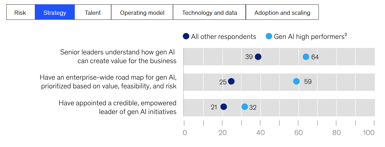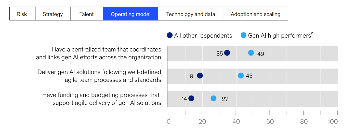또한, Gen AI 고성과자들은 자신의 조직이 일련의 리스크 관련 모범 사례를 따르고 있다고 답할 가능성이 훨씬 높았습니다(예시 11). 예를 들어, 이들은 법률 부서를 참여시키고 인공지능 솔루션 개발 초기에 위험 검토를 포함시키는, 즉 "왼쪽으로 이동"할 가능성이 다른 조직보다 거의 두 배나 높았습니다. 또한 전략 관련 모범 사례부터 확장 관련 모범 사례까지 다양한 기타 모범 사례를 채택할 가능성이 다른 기업보다 훨씬 높습니다.