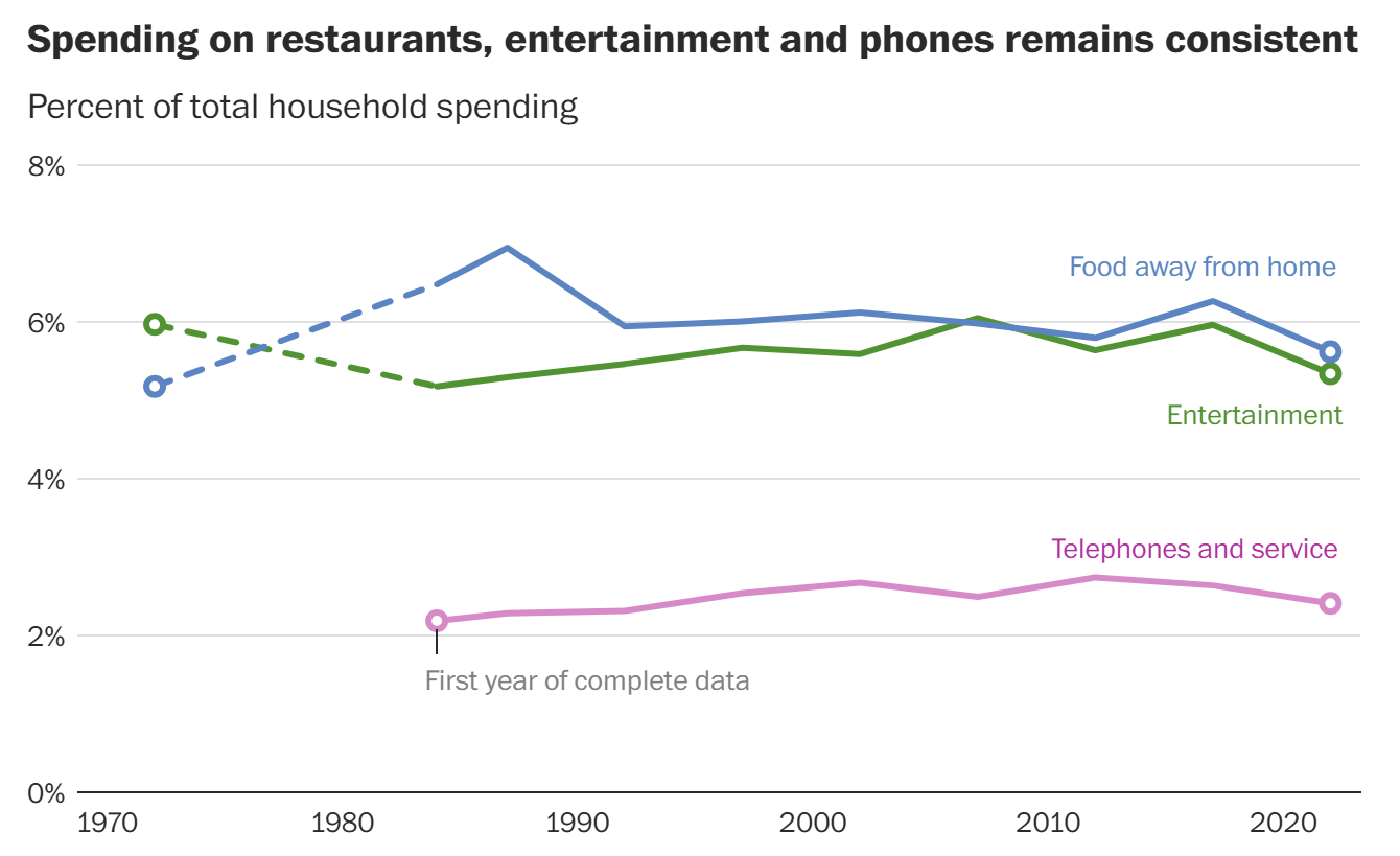 전반적으로 변동이 있긴 했지만, 식당, 오락, 전화에 대한 가계 지출 비율은 수십 년 동안 비교적 안정적으로 유지되었습니다.