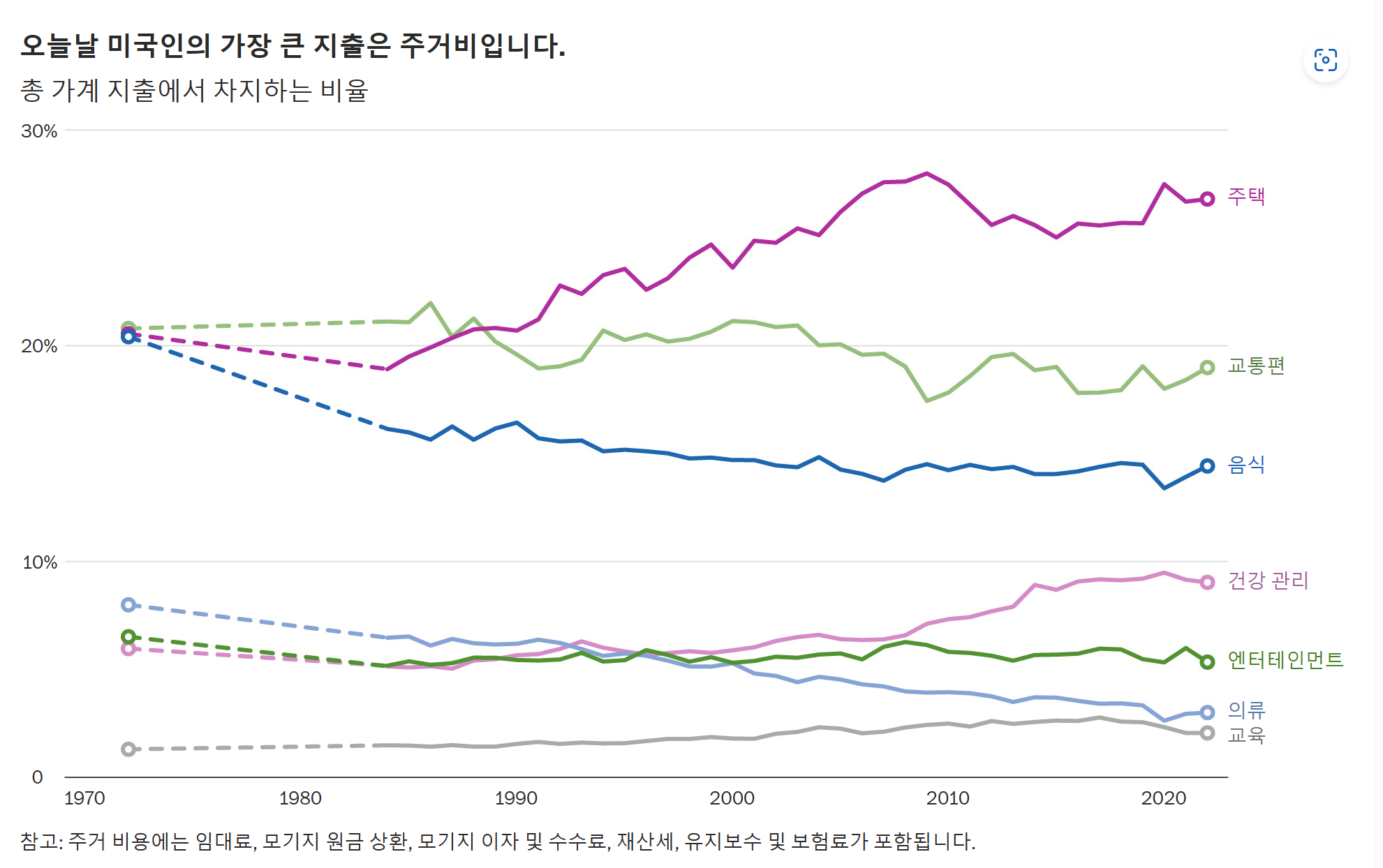 - 주거비 증가: 1984년 이후 주거비는 가계 예산의 19%에서 현재 27%로 증가했습니다.