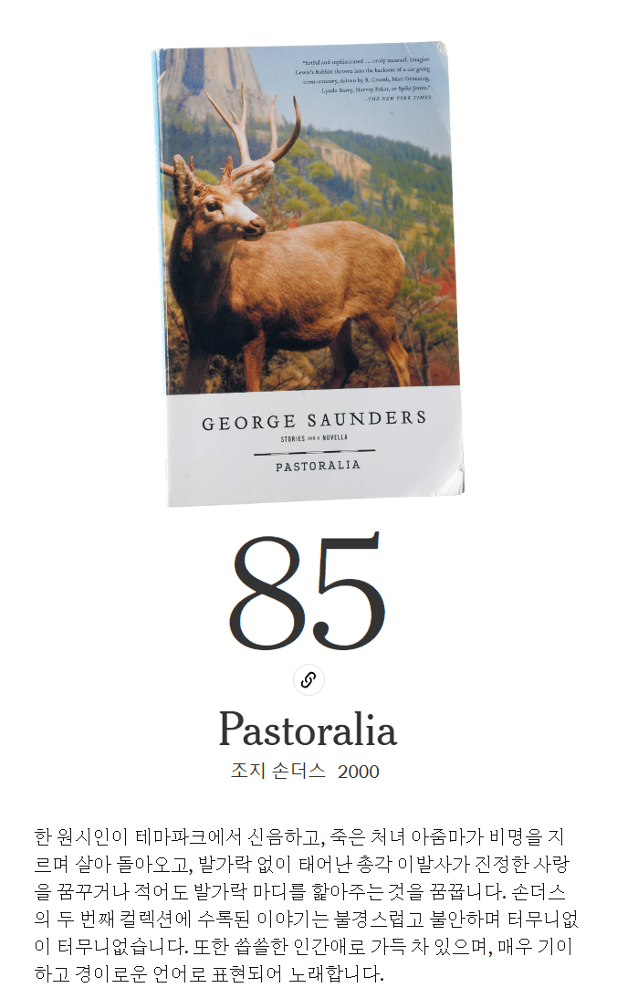 "Pastoralia"는 조지 손더스가 2000년에 출간한 단편 소설집으로, 현대 생활의 요소들이 합쳐지고, 비틀어지며, 확대되어 우리의 인간성과 그 희극성을 새로운 빛으로 드러내는 미국의 약간 기울어진 버전을 배경으로 합니다.