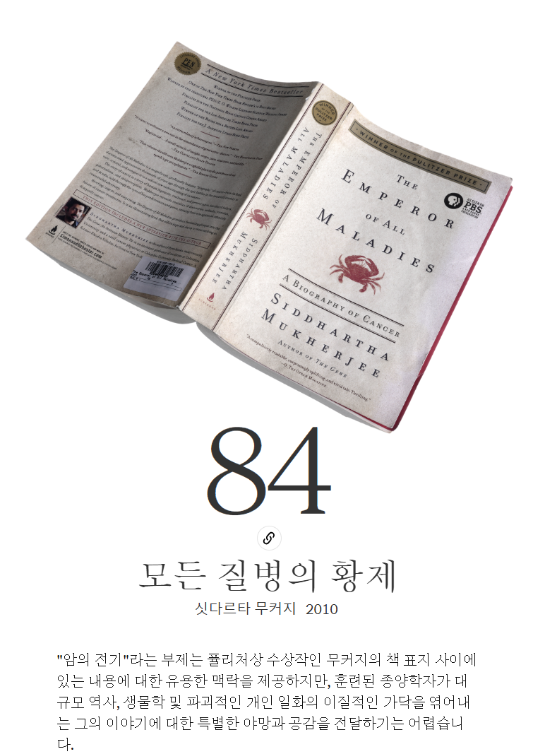 -이 책은 "암의 전기"로서, 암과의 전투에서 인간의 창의성, 회복력, 인내력뿐만 아니라 오만, 가부장제, 오해의 이야기입니다.