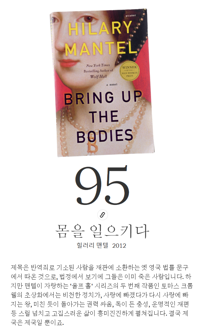 "Bring Up the Bodies"는 힐러리 맨틀의 뛰어난 역사 소설로, 토머스 크롬웰의 시각에서 헨리 8세와 앤 불린의 복잡한 관계와 정치적 음모를 생생하게 그려냅니다. 맨틀의 정교한 문체와 깊이 있는 인물 묘사는 독자들에게 강렬한 인상을 남기며, 16세기 영국의 정치적 혼란을 생동감 있게 전달합니다. 이 소설은 역사적 정확성과 소설적 상상력을 훌륭하게 결합하여, 독자들에게 깊이 있는 역사적 이해와 감동을 제공합니다.