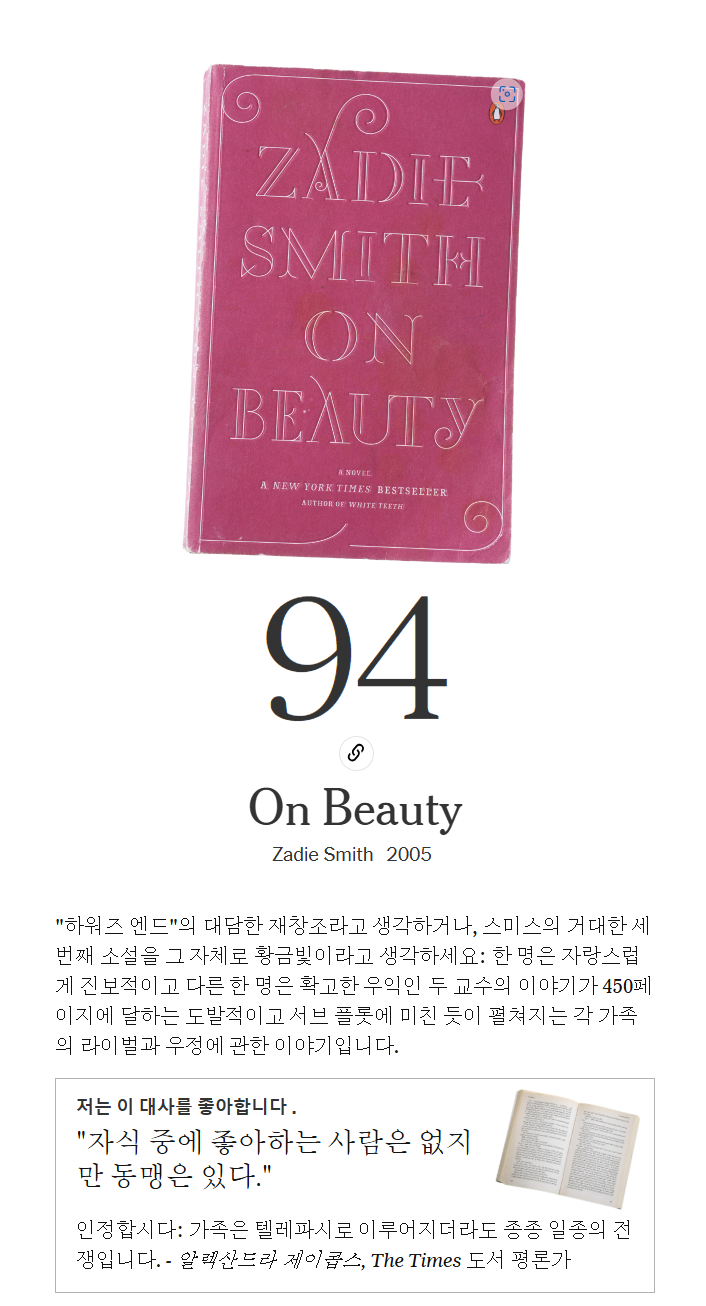 3. **문체와 유머**: 스미스의 문체는 유려하고, 그녀의 유머 감각은 소설의 무거운 주제를 부드럽게 만들어줍니다. 그녀는 인물들의 대화와 상황 속에서 자연스럽게 유머를 끌어내며, 독자들에게 즐거움을 줍니다.