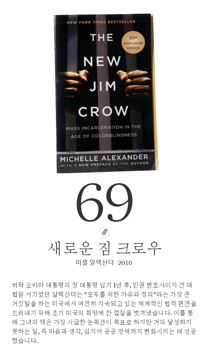 "The New Jim Crow"는 미셸 알렉산더(Michelle Alexander)가 쓴 책으로, 현대 미국에서 대규모 수감이 새로운 형태의 인종 차별적 사회 통제 수단으로 작용하고 있다는 주장을 펼치고 있습니다. 알렉산더는 법률가로서의 경험을 바탕으로, 마약 전쟁과 대규모 수감이 특히 흑인 남성들을 대상으로 한 ‘새로운 짐 크로우’ 체제를 형성하고 있다고 주장합니다. 이 체제는 정의 시스템 내에서 존재하기 때문에 일반 사람들이 관찰하기 어렵다고 합니다.