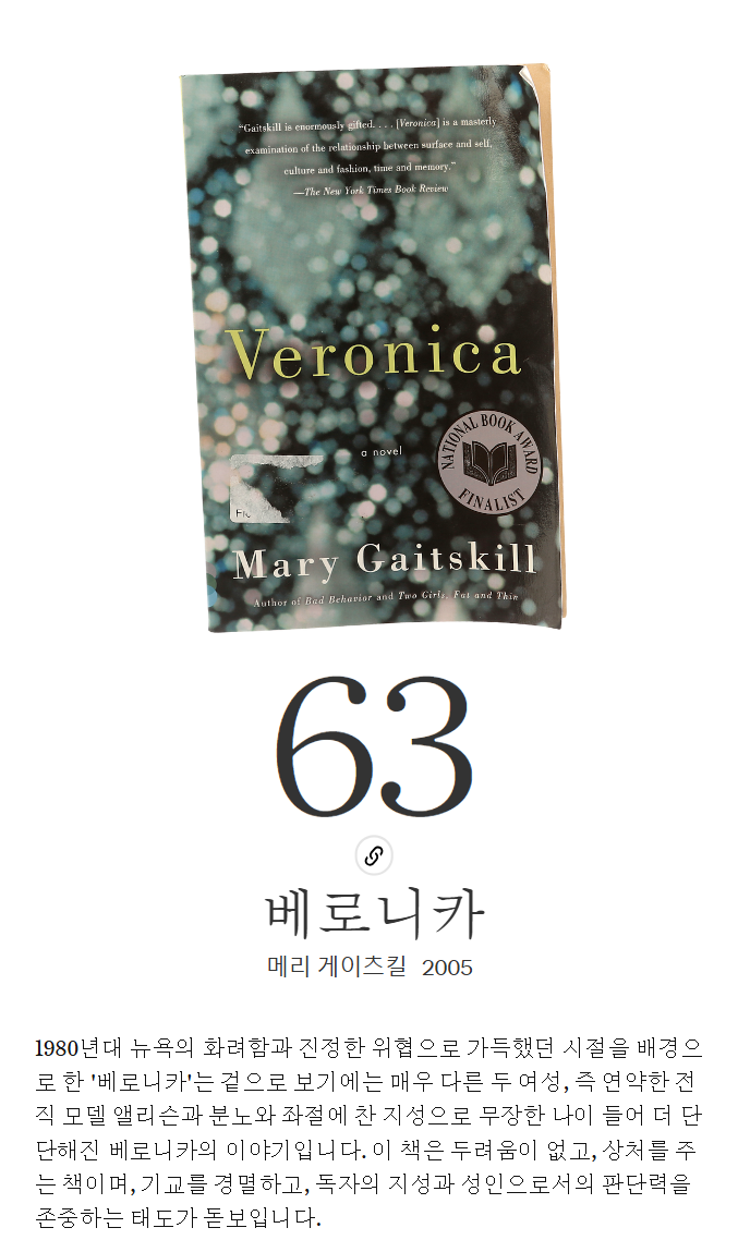 "Veronica"는 메리 게이츠킬(Mary Gaitskill)의 소설로, 1980년대 뉴욕과 파리를 배경으로 한 앨리슨과 베로니카라는 두 여성의 복잡한 우정을 다룹니다. 앨리슨은 샌프란시스코의 거리에서 발견되어 패션 모델로서 파리와 로마에서 활동하게 되지만, 경력이 좌절되고 사랑하는 사람과의 관계가 파국으로 끝나자 뉴욕으로 이주합니다1. 그곳에서 그녀는 베로니카라는 독특한 스타일을 가진 노련한 교정자와 우정을 쌓게 되며, 이 우정은 앨리슨이 다시 패션계로 돌아가는 것뿐만 아니라 베로니카가 에이즈로 내리막길을 걷는 것을 견디는 데 도움을 줍니다. 이 소설은 앨리슨이 나이가 들고 병들어가면서 과거의 경험과 자신이 되어버린 사람에 대해 의문을 갖게 되는 시점에서 회상됩니다.