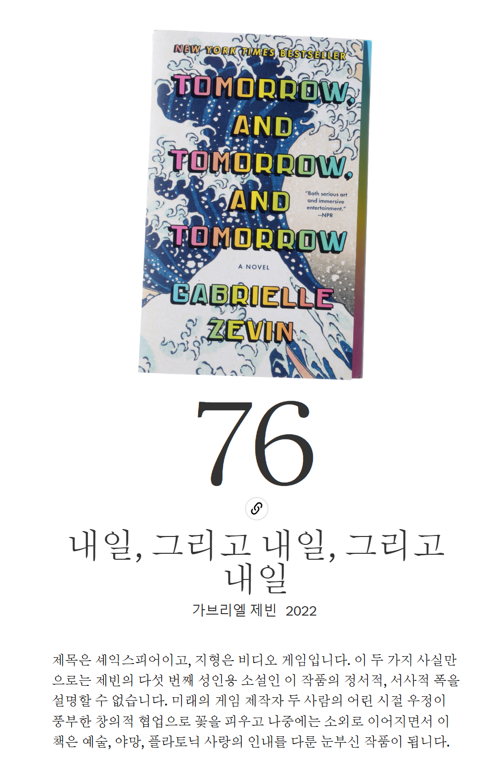 이번 주(오늘부터 80~61일)에 걸쳐 이 목록을 공개하면서 꼭 읽어보고 싶었던 책을 발견하거나, 다시 읽고 싶은 명작을 만나게 되기를 바랍니다. 무엇보다도 여기에 소개된 다양한 주제, 목소리, 의견, 경험, 상상력에서 여러분도 저희만큼이나 많은 영감을 얻고 눈부시게 빛나시길 바랍니다.