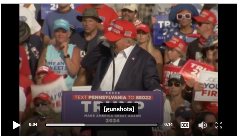- 경호실 요원들이 트럼프 대통령을 둘러싸고 5발의 총을 더 발사합니다. 군중들은 당황하며 비명을 지르고 몸을 웅크리고 있습니다. 중무장한 여러 명의 법 집행 요원을 포함한 더 많은 보안 요원들이 무대로 달려갑니다.