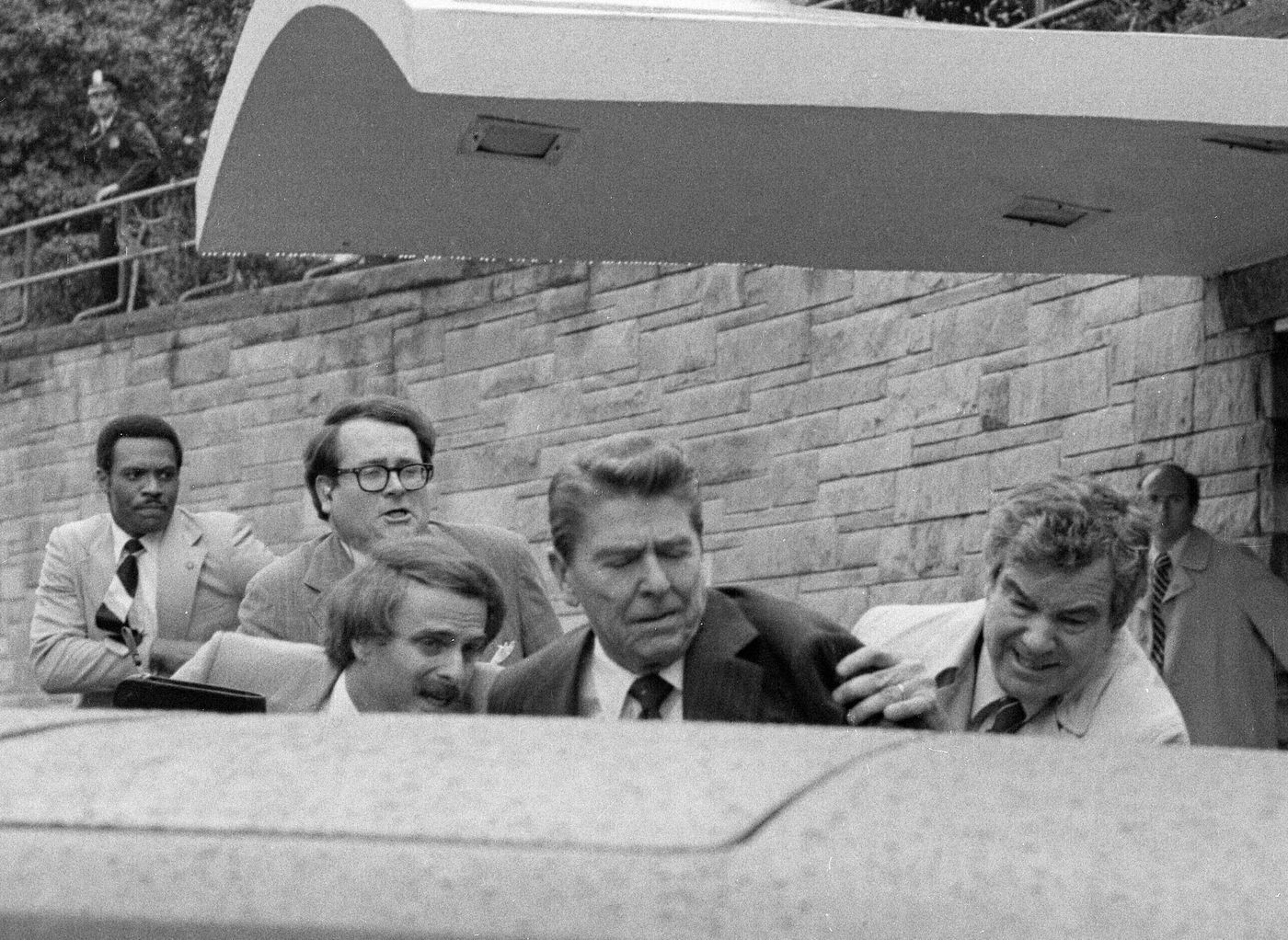 로널드 레이건 대통령이 1981년 워싱턴에서 총에 맞았다.   사진: 론 에드먼즈/AP통신
