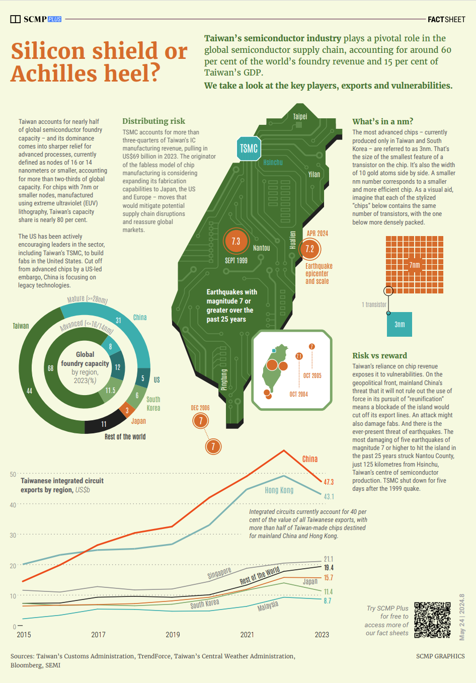 이 정보는 글로벌 반도체 산업에서 대만의 중요한 역할을 강조하며, 대만의 기술 리더십과 이 중요한 부문에서 대만의 지배적인 위치와 관련된 잠재적 위험을 모두 강조합니다.