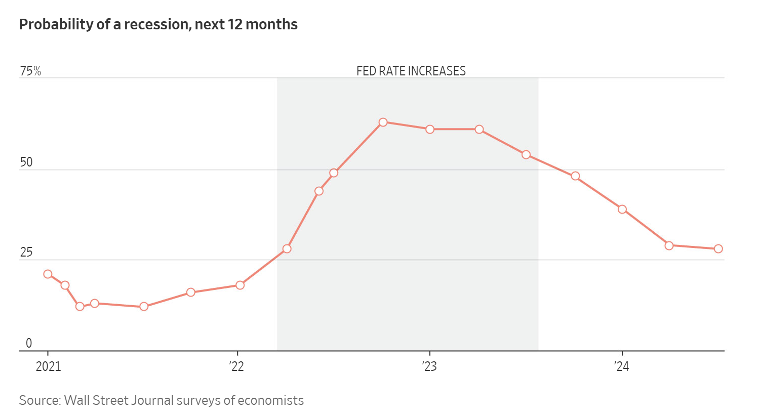 이 그래프는 경제학자들을 대상으로 한 월스트리트 저널의 설문조사 결과를 바탕으로 향후 12개월 내에 경기 침체가 발생할 확률을 보여줍니다. 데이터는 2021년부터 2024년까지입니다.