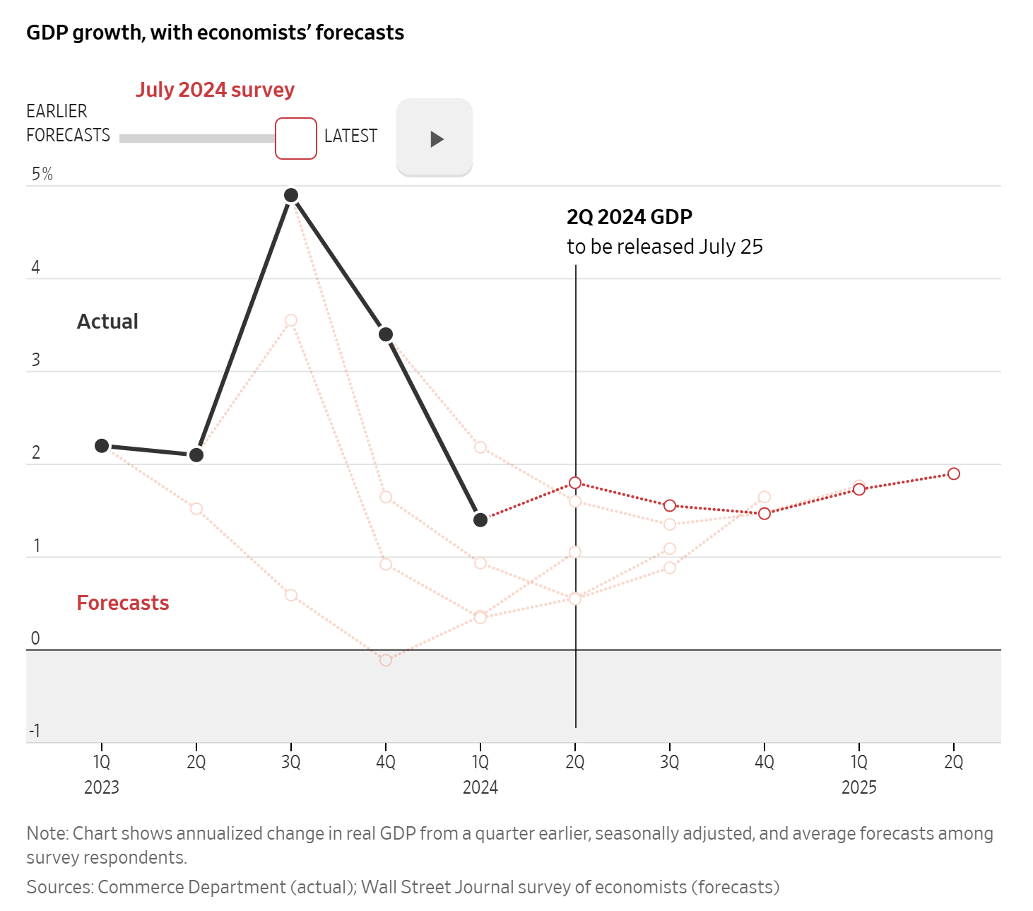 이 이미지는 2024년 7월에 실시한 월스트리트 저널 설문조사에서 나온 GDP 성장률 데이터와 경제학자들의 예측을 보여줍니다. 핵심은 다음과 같습니다: