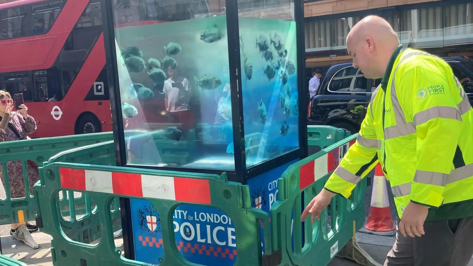 일요일의 작품인 파출소의 피라냐는 "안전한 보관"을 위해 길드홀 마당으로 옮겨졌습니다.