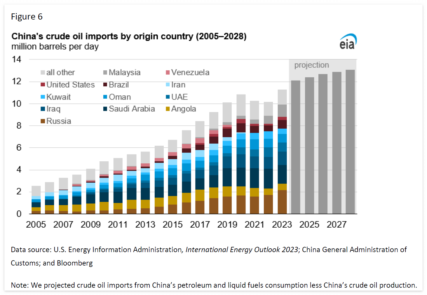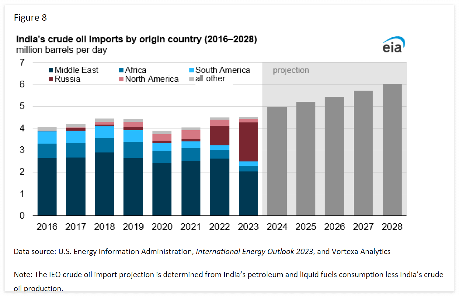 - 이 데이터는 미국 에너지정보청(U.S. Energy Information Administration), 국제 에너지 통계 2023(International Energy Statistics 2023), 그리고 Vortexa Analytics에서 제공한 정보에 기반하고 있습니다.