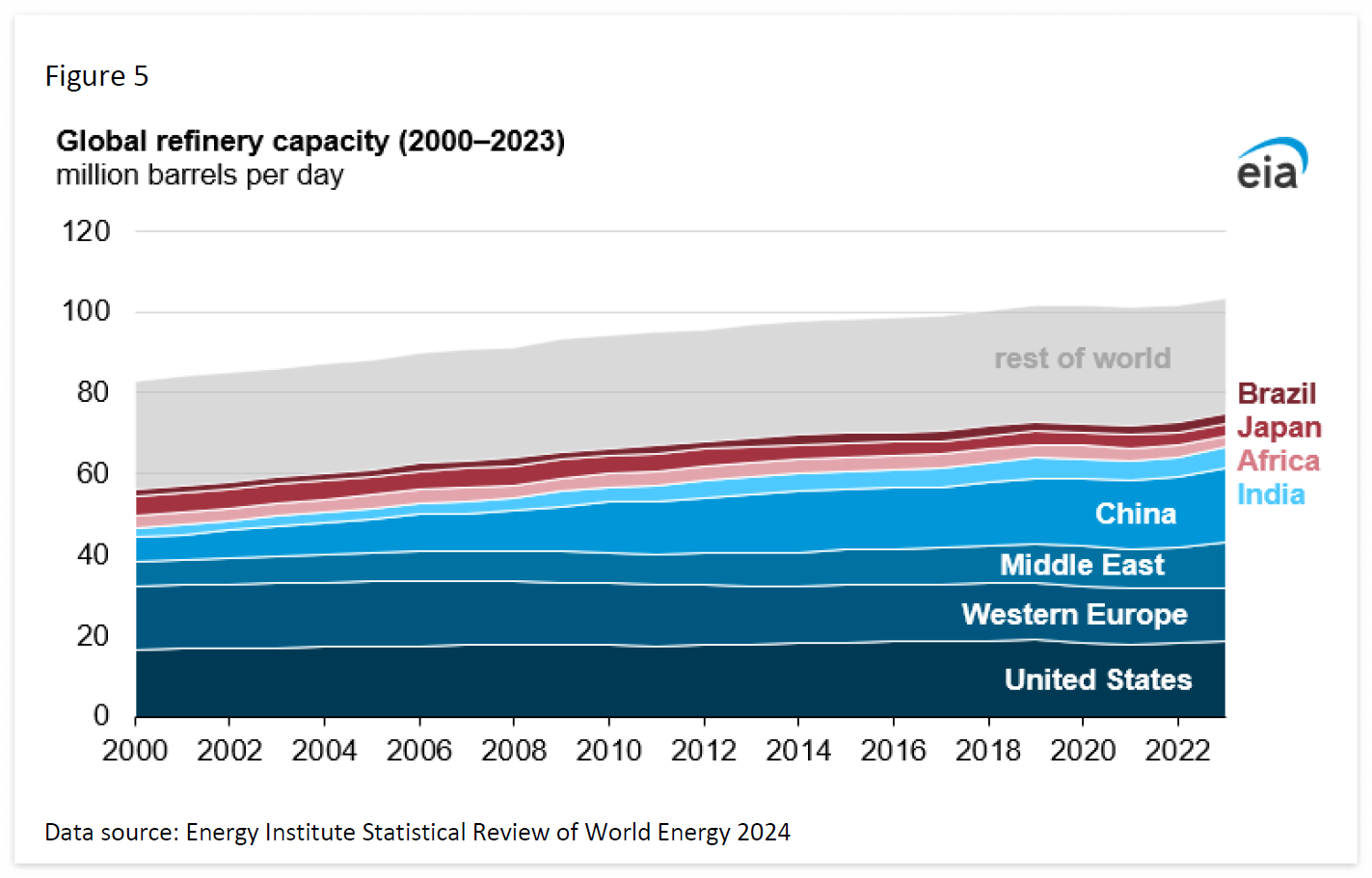 2023년 전 세계 정제 능력은 하루 1억 3,350만 배럴(b/d)로 추정됩니다. 최근 코로나19 팬데믹, 러시아의 우크라이나 침공, 홍해의 운송 차질 등으로 인해 세계 석유 시장의 구조적 변화가 일어나면서 향후 몇 년 내에 증가하는 수요를 충족하기 위해 얼마나 많은 정유 설비가 가동될 수 있을지에 대한 관심이 높아지고 있습니다. 이 분석에서는 2028년까지 가동 계획이 있는 몇 가지 주요 정유 투자, 총 정제 제품 생산량, 글로벌 원유 및 정제 제품 무역에 대한 의미를 살펴봅니다. 정제 제품 생산량 증가 계획의 대부분은 아시아 태평양 지역(주로 중국과 인도)과 중동 지역에서 이루어질 예정입니다. 2024~28년 동안 260만 배럴/d에서 490만 b/d의 정제 능력이 가동될 것으로 예상됩니다.