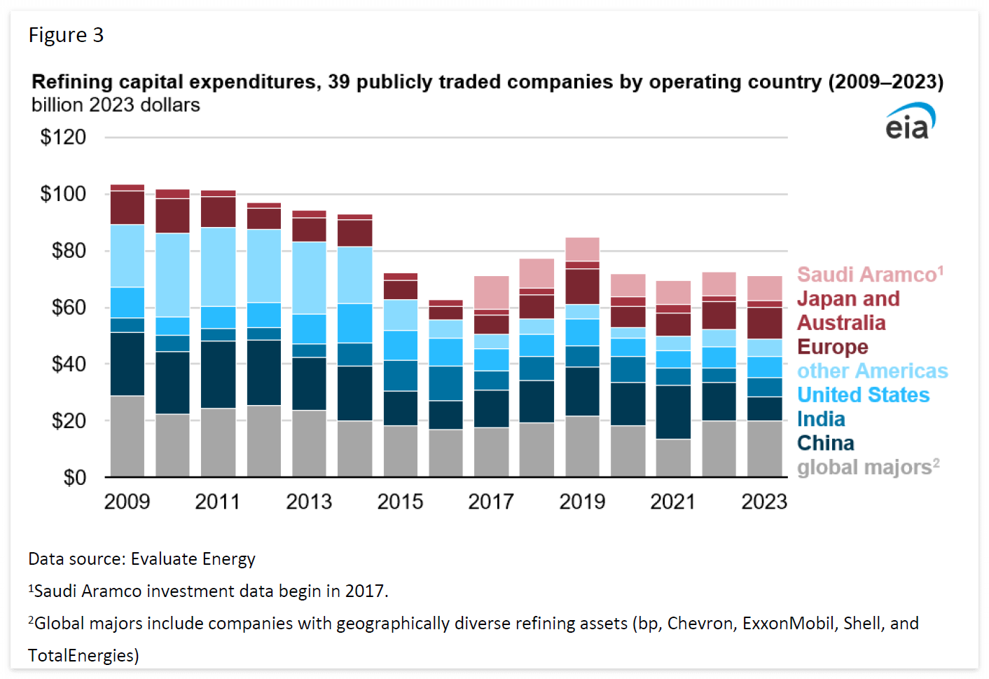 2019년에 상장되었지만 2017년까지의 정제 자본 지출 데이터를 제공하는 사우디 아람코는 거의 매년 인플레이션을 조정한 후 평균 90억 달러 이상의 정제 자본 지출을 기록하며 단일 기업으로는 가장 많은 투자를 해왔습니다. 재무제표를 공개하는 중국과 인도의 5개 정유사는 2009년 이후 총 정유 자본 지출의 29%, 매년 평균 150억 달러에서 280억 달러 사이를 투자했습니다.