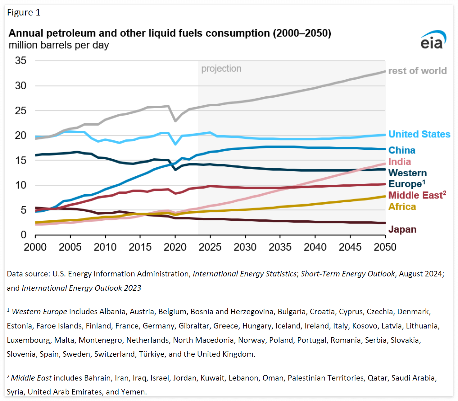 이 이미지는 "연간 석유 및 기타 액체 연료 소비량 (2000–2050)"을 나타내는 선 그래프입니다. 그래프는 하루당 백만 배럴 단위로 측정된 주요 국가 및 지역의 연간 연료 소비량을 보여줍니다. 그래프는 2000년부터 2050년까지의 기간을 다루고 있으며, 2025년 이후부터는 예측된 데이터를 포함하고 있습니다.