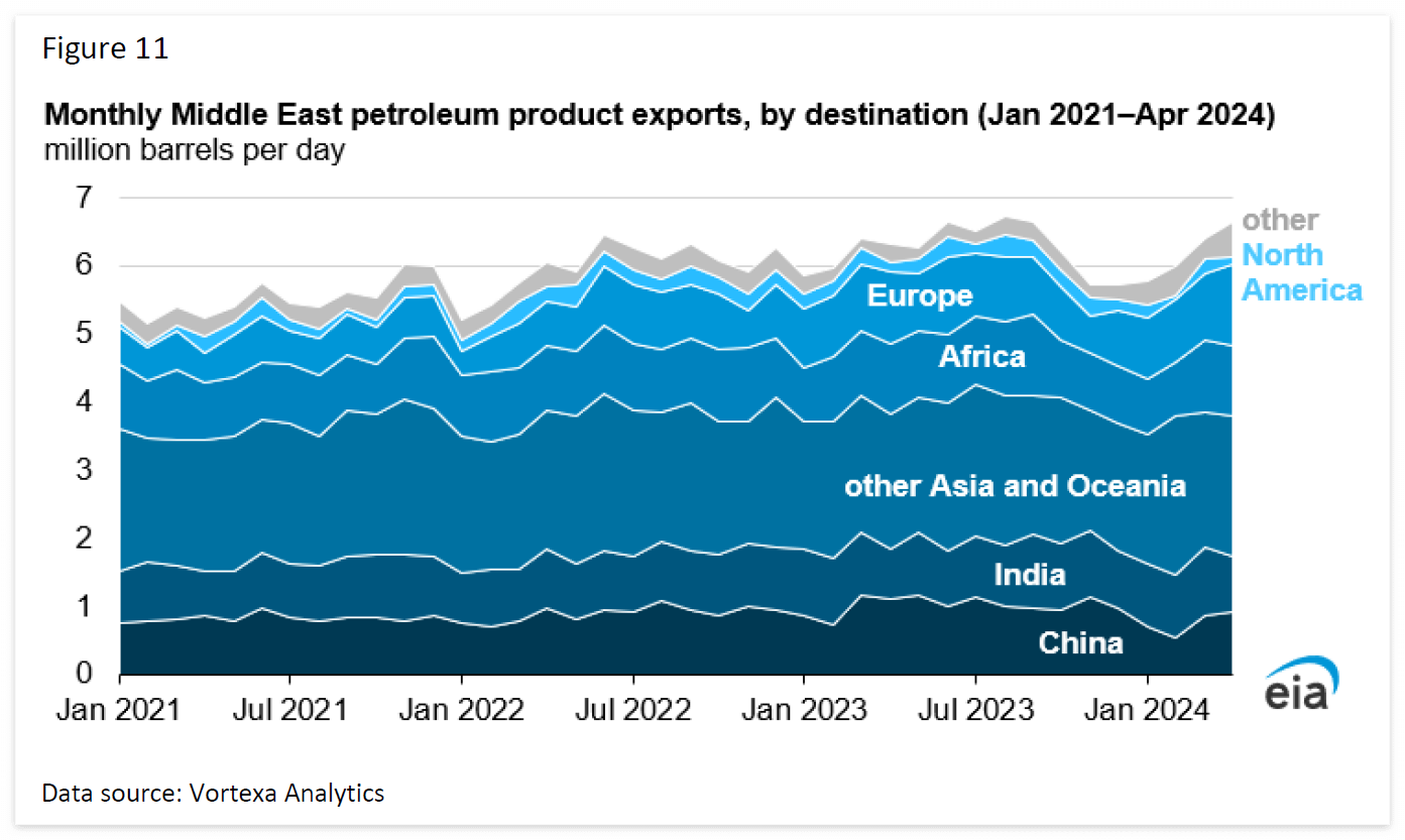 중국과 인도는 2022년과 2023년에 중동에서 석유 제품을 가장 많이 수입하는 두 국가입니다. 그러나 중국과 인도에서는 액체 연료에 대한 수요가 증가하고 있고 노후화되고 덜 정교한 정유소가 폐쇄될 수 있기 때문에 이러한 설비 확장의 영향이 제한될 수 있습니다.