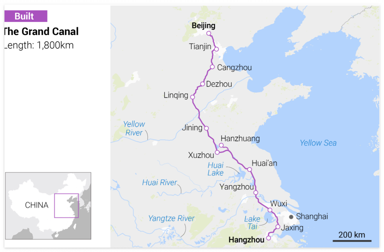 - 길이와 경로: 운하의 총 길이는 134.2km로, 헝저우의 위강에 있는 시진 저수지에서 진강을 거쳐 베이부 만까지 연결됩니다.