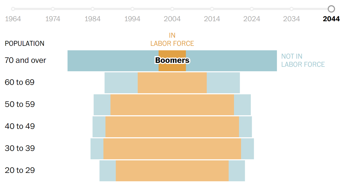 지난 50년 동안 1946년에서 1964년 사이에 태어난 베이비부머 세대는 아나콘다를 먹어치우듯 미국 노동력을 이끌어 왔습니다. 이들이 고령화됨에 따라 노동력의 연령도 점점 높아지고 있습니다. 이들이 은퇴함에 따라 근로자 대 은퇴자 비율은 그 어느 때보다 낮아질 것입니다.