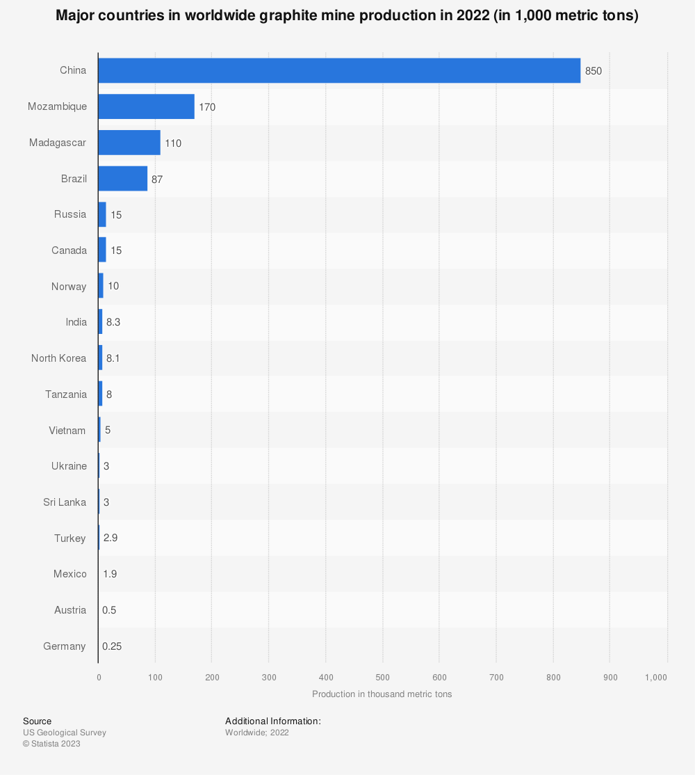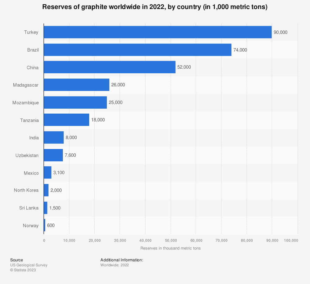 2022년 전 세계 흑연의 총 생산량은 약 130만 톤으로 추정됩니다. 중국은 세계 최고의 흑연 생산국이지만, 중국의 흑연 매장량은 세계에서 세 번째로 많습니다. 세계에서 가장 많은 흑연 매장량을 보유한 국가는 터키입니다. 2022년 터키의 천연 흑연 매장량은 약 9천만 미터톤에 달합니다. 미국의 흑연 수입에서 가장 높은 비중을 차지하는 국가는 중국으로, 2018년부터 2021년까지 미국 전체 흑연 수입의 33%를 차지했습니다.