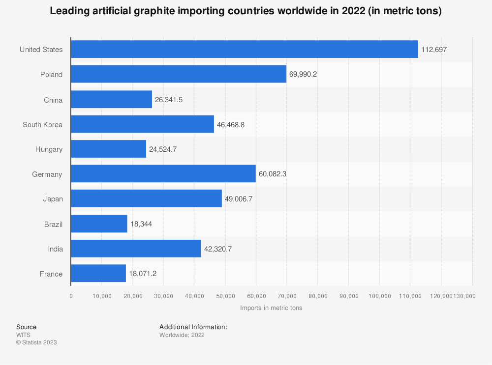 미국은 2022년 약 112,697톤으로 전 세계 인조 흑연의 주요 수입국이었습니다. 이는 이 부문에서 2위를 차지한 폴란드가 수입한 양보다 훨씬 많은 양이었습니다. 인조 흑연은 합성 흑연이라고도 합니다.