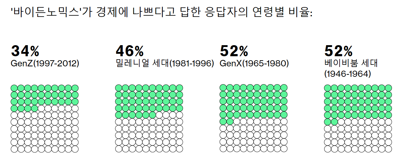 - 바이든 대통령은 바이든노믹스라는 경제 정책을 펼치고 있지만, 스윙 스테이트 유권자들의 호응을 얻지 못하고 있습니다. 특히 베이비붐 세대가 불만을 표시하고 있습니다.